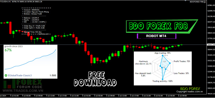 - Lợi Nhuận 67% Trong 6 Tháng Kết quả thử nghiệm và sử dụng thực tế đã cho thấy BDOFOREX F88 đạt được lợi nhuận lên tới 67% chỉ trong vòng 6 tháng. Đây là một biểu tượng số, phân tích thị trường bằng chứng và thực hiện kết quả giao dịch của bot.